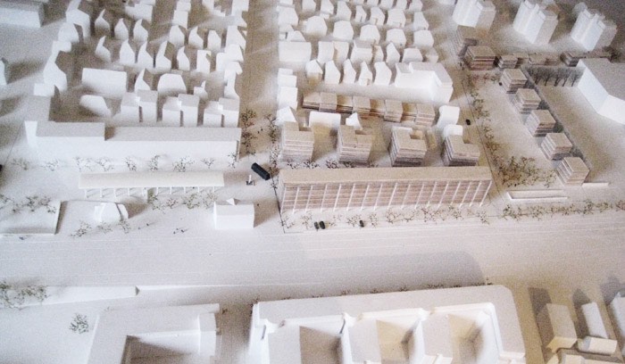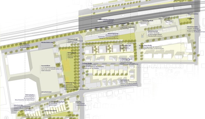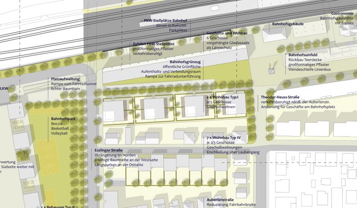 Bebauung des Bahnhofsumfeld Fellbach mit Wohnungen und Reihenhäusern. Anlegen von Park/Grünanlagen.