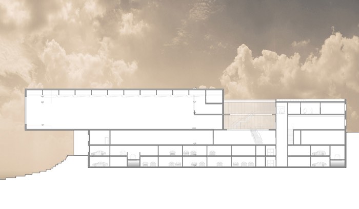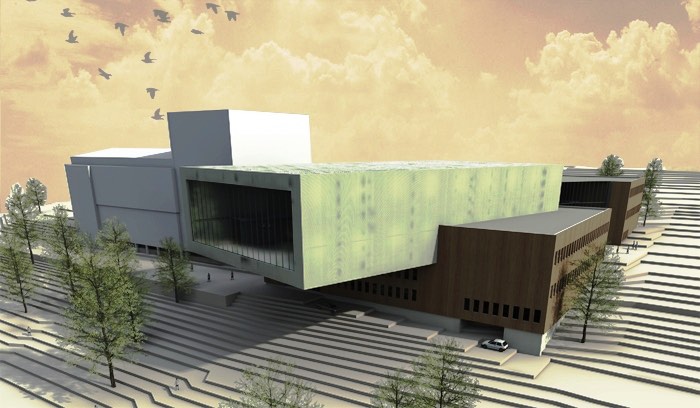 Stadthalle mit Bühne, mit maximal 700 Sitzplätzen. Mehrere Nebenräume für Gesellschaften von 30 bis 100 Sitzplätzen. Tiefgarage mit 200 Stellplätzen. Großer Saak, weit auskragend, gedreht mit blick auf das Stadtzentrum. Massivbauweise. Fassade mit 8 Kalksandsteinphasen. Fassade mit Streckmetallverkleidung.